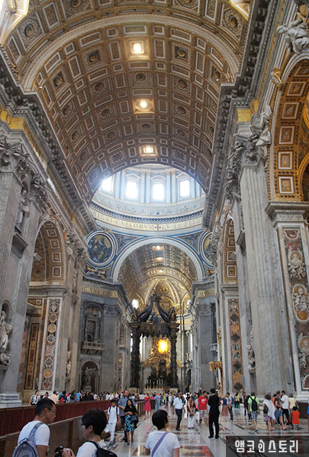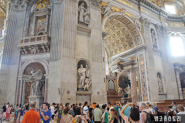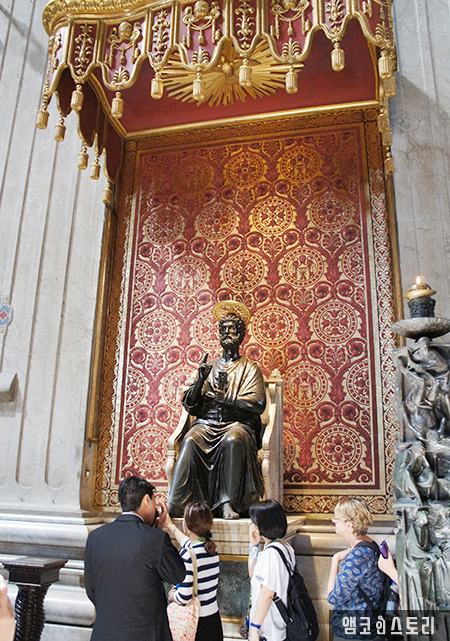 교황님의 재단이 있는 발타키노 뒤로 보이는 것이 베드로의 의자와 성체 경당이다. 빛이 통과하는 얇은 대리석에 비둘기 모양이 있으며(빛이 너무 강해 비둘기 모습이 잘 보이지 않으나 자세히 보면 무언가 보인다), 그 주위로 배치된 12개의 공간은 십이사도를 의미한다고 한다. 그 주변을 둘러싼 천사들의 모습. 이것이 바로 천국에서 오는 한 줄기 빛이고, 그 앞에 있는 의자에 베드로 성인이 앉아있는 것이다. 천국으로 가는 길에 우리가 있다!