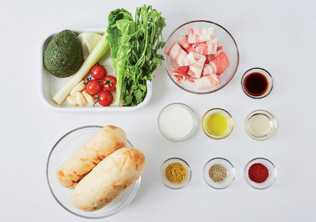 2인분 : 방울토마토(4개), 아보카도(1개), 로메인(4장), 양파(¼개), 대파(15cm), 미나리(⅓줌=50g), 마늘(5쪽), 대패삼겹살(100g), 치아바타(2개)