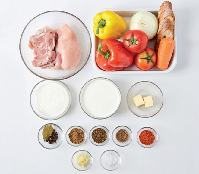 2인분 : 양파(1개), 당근(½개), 토마토(2개), 닭고기(가슴살, 다리 살 각 200g), 생크림(200g)
