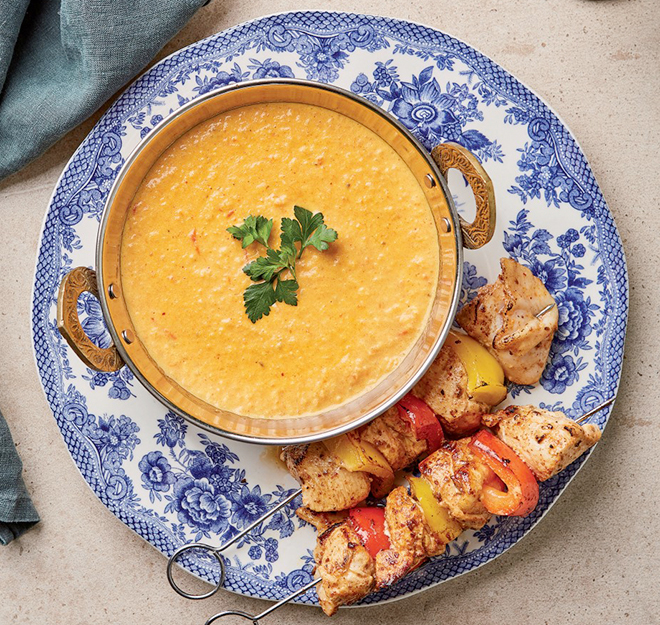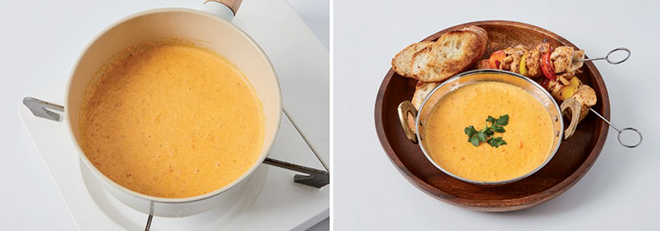 꼬치에 파프리카와 닭을 번갈아 끼운 뒤 중간 불로 달군 팬에 닭이 익을 때까지 굽고, 그릇에 카레를 담은 뒤 닭꼬치와 바게트를 곁들여 마무리한다.