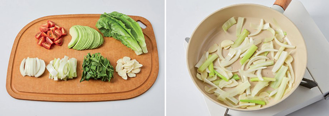 ② 중간 불로 달군 팬에 올리브유를 두른 뒤 납작 썬 마늘, 양파, 대파를 넣어 1분간 볶는다.