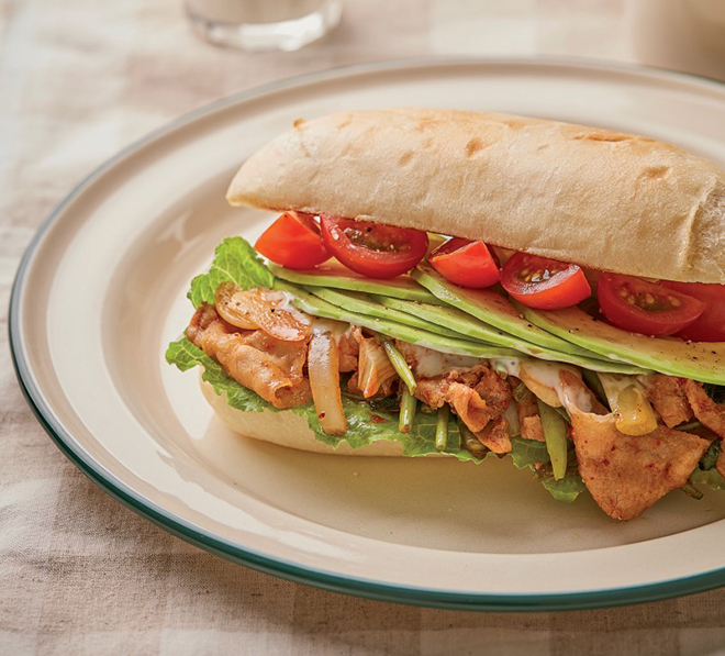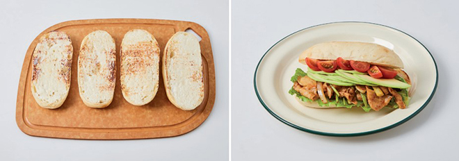 ⑤ 치아바타는 마른 팬에 안쪽 면을 노릇하게 구워 꺼내고, 빵 안쪽에 허니 요거트소스를 바른다.