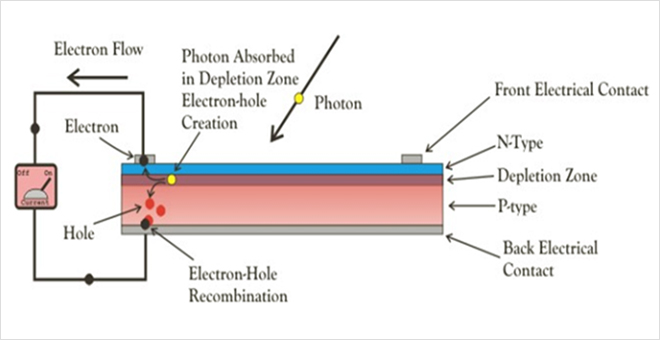 태양전지, 정확히는 P형 반도체와 N형 반도체가 접합된 모양입니다. 생성된 전자는 N형 반도체로 끌려가고 정공은 P형 반도체로 흘려가면서 전류가 생성됩니다. 이것은 일반적으로 높은 곳에서 낮은 곳으로 흘러가는 물이라고 생각하면 더욱 쉽습니다. 정공과 전자의 몰림이 전위차를 만들어내고 물의 역할을 하는 전류가 높은 전위에서 낮은 전위로 흘러간다고 생각하면 되지요. 물론 전자는 그 반대 방향으로 흐르고 있답니다. 일반적으로 전자가 움직이는 방향의 반대 방향을 전류의 방향이라고 하는데요, 전자와 정공이 움직이면 전류가 생성됩니다. 이를 위해 p형 반도체와 N형 반도체를 접합시켜 극성에 따라 이 전자와 정공이 움직이게 됩니다. 태양 빛을 비춰주는 것만으로 전기 에너지를 생산할 수 있다는 사실은 참으로 놀랍지요?