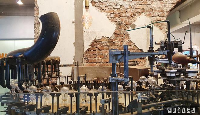 주문을 마치고 발길을 돌리자 거대한 설치물이 눈에 띕니다. 과거(아마도 창업 초기일 듯) 일광전구를 생산하던 공장의 설비를 그대로 옮겨와 전시 중인 섹션으로, 거대한 기계장치의 실물이 압도적으로 다가오네요. 계속 돌아가는 오래된 기계를 보고 있자니 ‘백열전구에 대한 신념을 바탕으로 오래된 빛에 디자인을 더해 새로운 제품으로 만들어 나가는 도전을 계속’한다는 일광전구의 경영방침이 떠오르네요. 아름다운 빛을 올바르게 사용하며 가치 있는 삶을 가꾸어가는 지혜를 전하는 길잡이! 일광전구의 행보를 응원합니다.