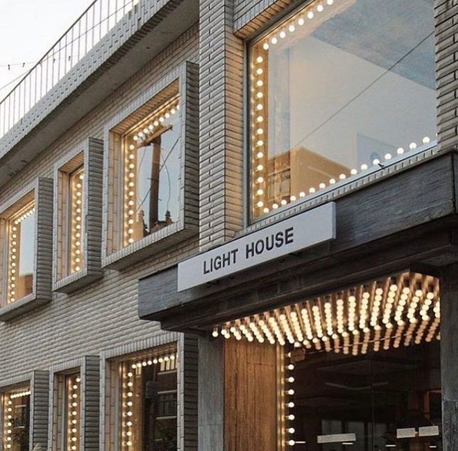 동인천 개항로 일대의 골목을 걷다 만나게 되는 <라이트하우스>. 심플한 건물 외관은 세월이 느껴지는 레트로풍의 타일 벽돌로 마감되었어요. 전면으로 큰 통창이 시원하게 뚫려 있으며, 창을 둘러쳐 노란색 백열전구가 장식되어 있습니다. 출입구 역시 알알이 전구가 입장을 밝혀주는데요, 빼곡히 박힌 전구는 낮은 조도로 눈의 피로감을 덜어줍니다.