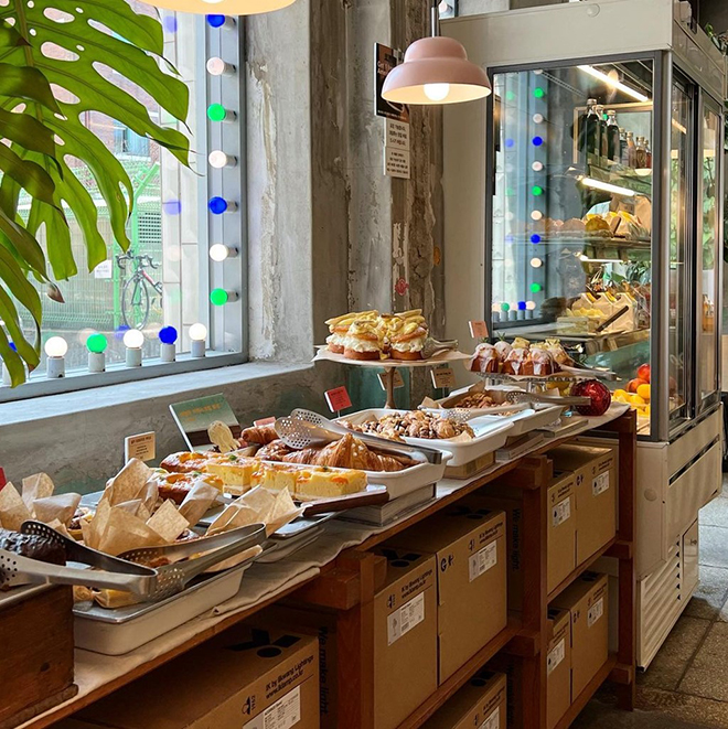 카페 공간을 들어서자 창가 쪽으로 라이트하우스에서 판매하는 베이커리류가 종류별로 트레이에 담겨 진열되어 있어요. 오가는 발길을 유혹하는 극강의 비주얼! 빵 덕후라면 집게를 들지 않고는 못 배길 것입니다. 커피와 티 종류도 다양해요. 취향에 맞는 선택이 가능하며 콜드브루 원액에 개항로 맥주도 판매하네요! 원두와 티백도 판매하고 있었는데 구매 시 원두는 아메리카노, 티백은 티 1잔이 제공된다고 하니 참고하면 좋을 듯합니다. 굿즈로는 라이트하우스 배지를 판매하고 있었어요.