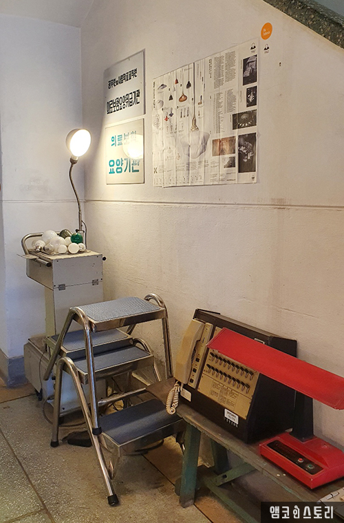 본관과 별관으로 이루어진 <라이트하우스>는 중간의 연결통로로 이동할 수 있어요. 짧은 복도로는 예전 병원으로 운영 시 사용했던 물건들을 부러 남겨두었습니다. 잠깐이지만 추억의 생활사 박물관을 체험하는 기분을 느껴봅니다.