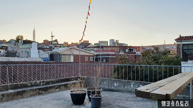 계절을 오롯이 즐길 수 있는 야외공간은 테라스 좌석과 마당, 마당 창고 위 좌석, 건물 옥상으로 구분됩니다. 저마다 독특한 분위기로 매력이 다른데요, 저녁이 되면 어스름 속에 알알이 빛나는 일광전구가 낭만을 전하는 공간, 옥상에 오르자 확 트인 전경으로 인천 시내의 모습이 한눈에 들어오네요.