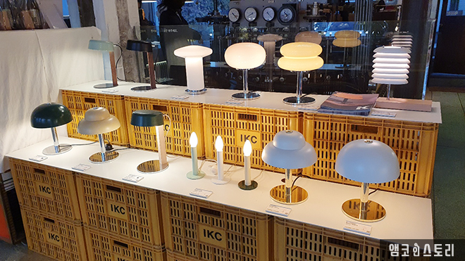 <라이트하우스>는 일광전구의 쇼룸을 겸하는 카페입니다. 내부를 들어서자 일광전구에서 생산 중인 다양한 조명을 라인별로 전시해 놓은 쇼룸공간을 만날 수 있는데요, SNOWMAN, FROG38, TEACUP 4A Table Stand 등 일광전구 홈페이지에서 보았던 제품들의 실물을 접하니 반가운 마음이 앞섭니다. 조명 기구들을 직접 눈으로 확인하고 구매도 할 수 있는 섹션으로 제품마다 제품명과 가격이 친절히 명시되어 있어 편리한 쇼핑이 가능하답니다.