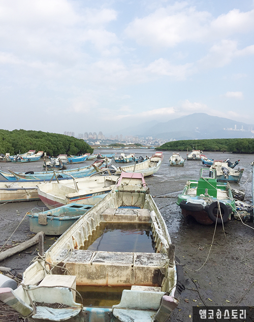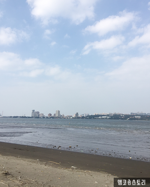 단수이 하구 남안에는 맹그로브 숲이 있어 자연 생태계가 잘 유지되어 있습니다. 단수이 지역의 강변은 여러 건물들과 바닷가가 잘 어우러져 있습니다. 바닷가에서 여유롭게 낚시를 즐기는 분도 있네요.