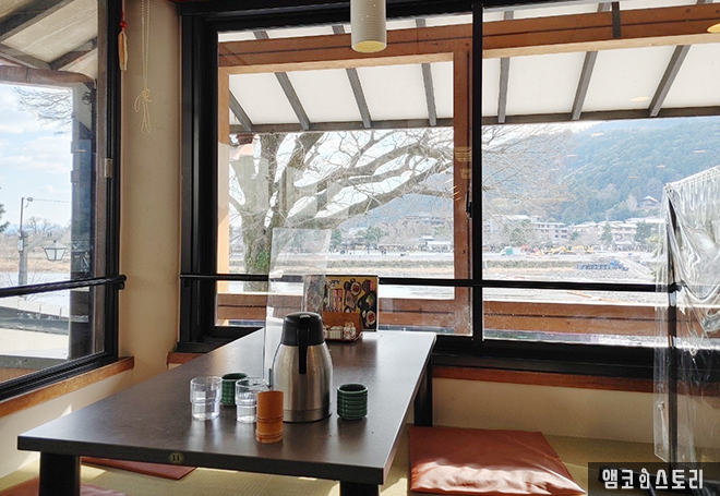 먹거리는 소바와 덴동, 그리고 카이센동 등을 추천하는 블로그들이 많았으므로 필자와 일행은 텐동집으로 정하고 도게쓰교가 내려다 보이는 일본다운 분위기가 있는 식당으로 갔습니다. 벽 전체가 일본 건축 양식인 창문으로 되어있고 밖은 예쁜 강과 소나무가 그림처럼 내다보이는 식당이었습니다.