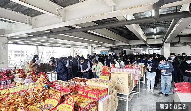 보통 사장님 주재하에 기원을 하며, 기원 후 모두 다 함께 세 번 절을 하는 순서가 옵니다.