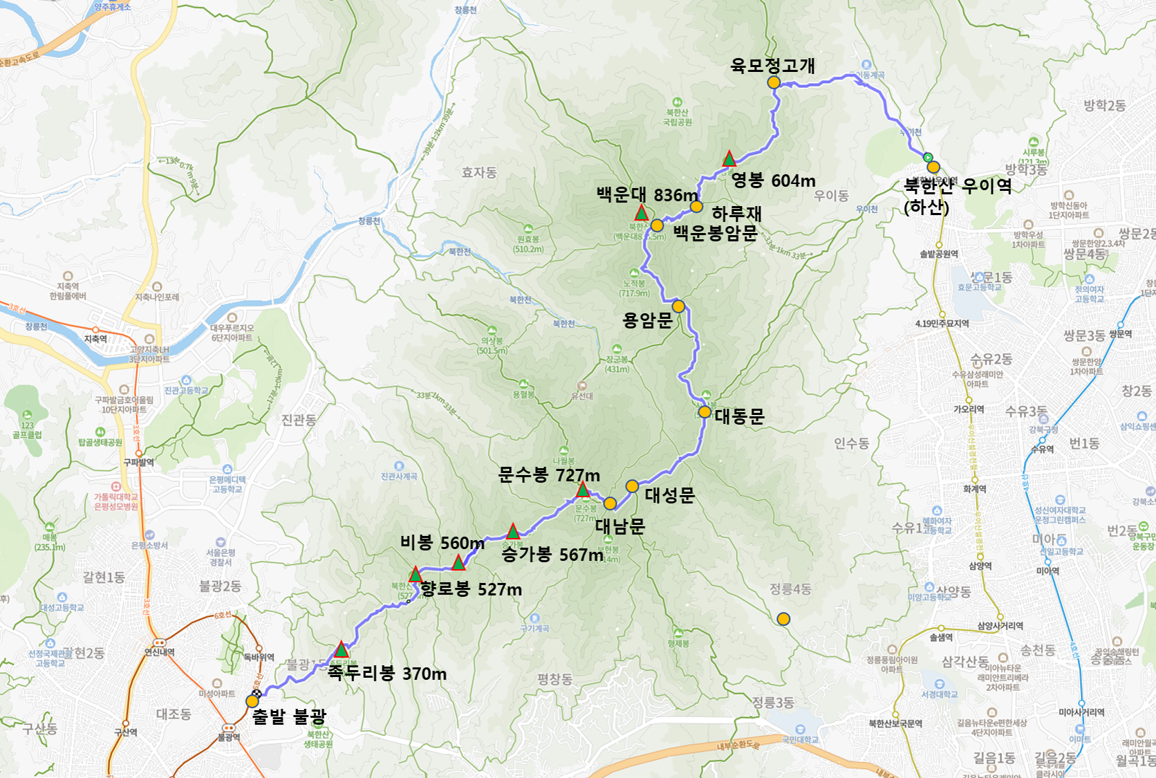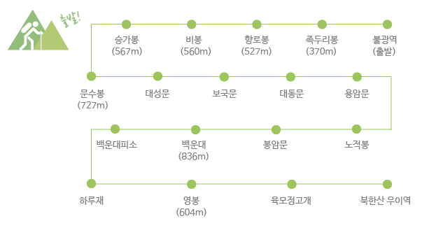 크고 작은 봉우리만 40여 개나 되는 북한산의 등산은 둘레길부터 등산코스가 아주 다양합니다. 그중에서 불광역에서 시작하여 북한산 우이역으로 하산하는 코스는 주능선을 따라 주요 봉우리와 문을 거치는 코스로 북한산을 제대로 즐기기 좋은 코스입니다.