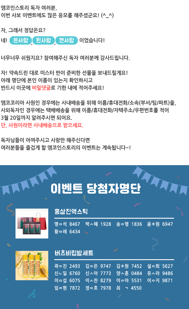 | 앰코코리아 인스타그램 팔로우 이벤트 결과 발표 _ 웹진 [앰코인스토리] (24) | 2023.03.27 |