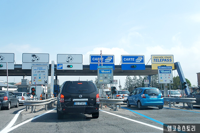 톨게이트 통행권에 ROMA라는 글자가 너무나도 반갑고, 로마를 떠난다고 생각하니 아쉽기도 하다. 톨게이트에서 위에 붙어있는 표지판을 잘 봐야 하는데, 자세히 보면 어디로 줄을 서야 할지 힌트가 있다. 정답은 손 표시가 있는 게이트로 가는 것인데, 손 표시는 사람이 표를 받는다는 표시다. 손 표시가 없이 지폐와 동전이 있는 표지판 밑으로 들어가면, 생전 처음 보는 기계와 통행료 씨름을 해야 한다.