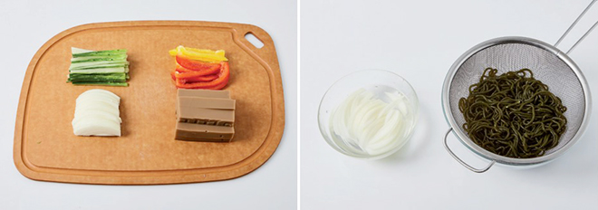 ② 양파는 찬물에 5분간 담가 매운맛을 제거하고, 해조국수는 찬물에 헹궈 건진다.