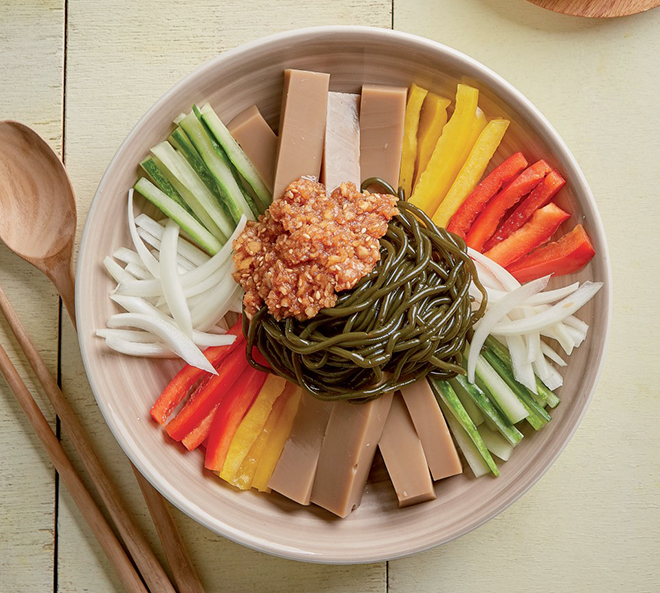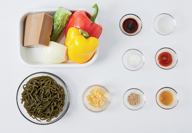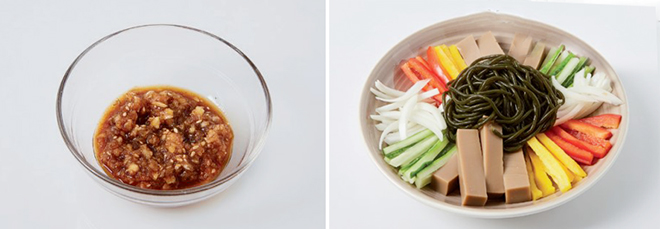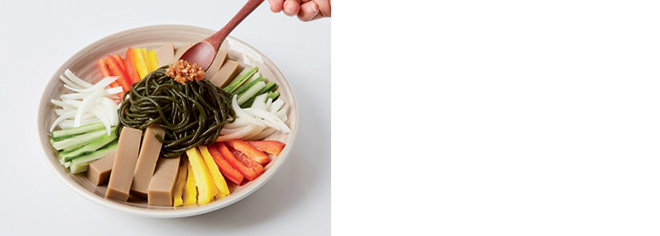 Tip. 채소와 묵은 해조국수를 둘러싸고 색깔별로 가지런히 배치하면 보기에 좋아요.
