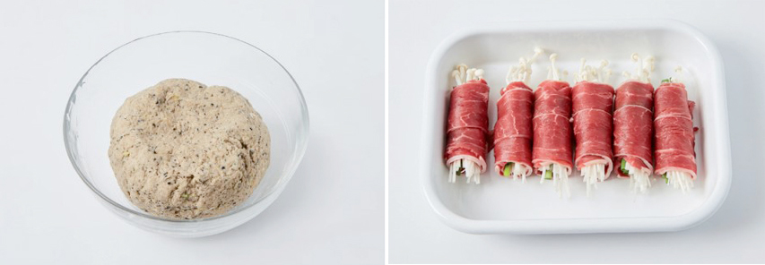 ④ 불고기용 소고기를 펼치고, 팽이버섯과 쪽파를 위에 올려 돌돌 만다.