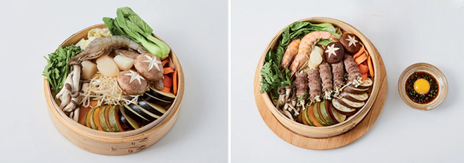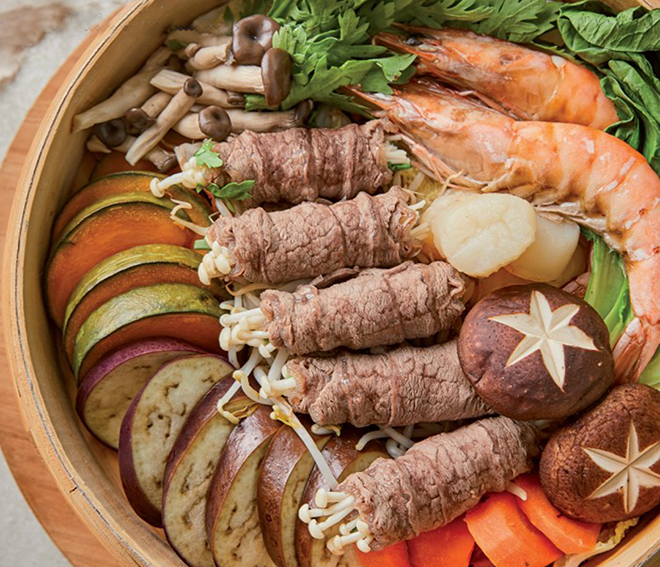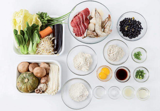 2인분 : 팽이버섯(½봉), 느타리버섯(½줌), 알배추(½개), 쪽파(3대), 가지(½개), 당근(¼개), 흰다리새우(7마리), 관자(4개), 삶은 검은콩(½컵), 소고기(불고기용 부챗살, 200g), 숙주(⅓줌), 달걀노른자(2개)