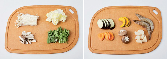 ② 가지와 당근은 도톰하게 어슷 썰고, 단호박은 씨를 제거한 뒤 7~8쪽으로 썰고, 표고버섯은 별 모양으로 칼집을 내고, 새우는 깨끗하게 씻고, 관자는 한입 크기로 썬다.