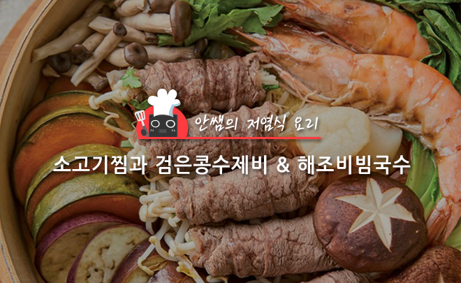 오늘 소개할 요리는 소고기찜과 검은콩수제비, 해조비빔국수입니다. 소고기찜과 검은콩수제비는 칼륨 함량이 높은 단호박, 느타리버섯, 검은콩, 감자를 넣어 나트륨 배출에 도움을 주었고 해조비빔국수는 스리라차 소스로 간을 맞춰 나트륨의 사용을 줄였습니다.