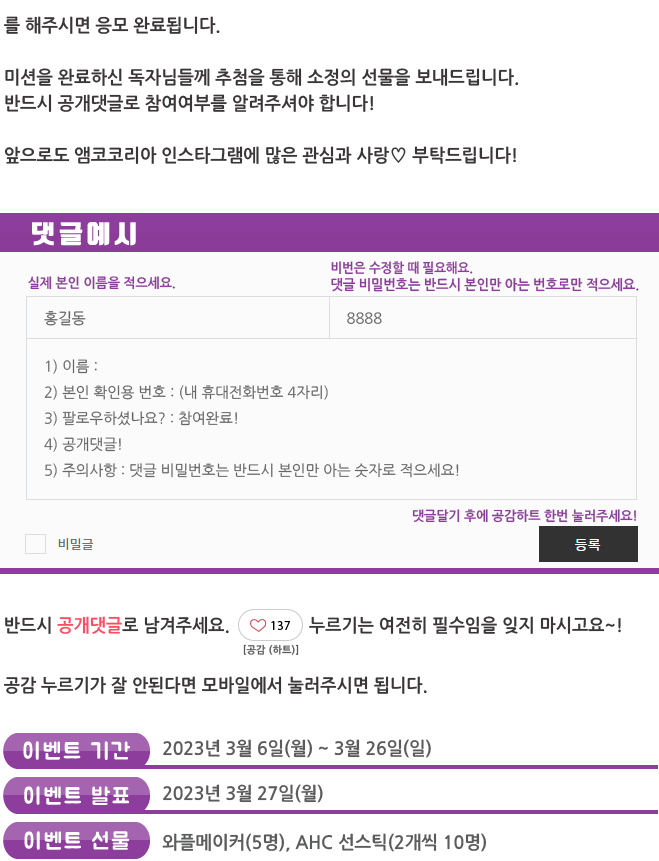 | 앰코코리아 인스타그램 팔로우 이벤트 결과 발표 _ 웹진 [앰코인스토리] (24) | 2023.03.27 |