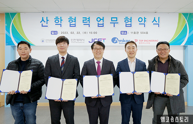 2월 22일, 앰코코리아는 인천광역시, 인하공업전문대학(이하 인하공전)과 함께 반도체 후공정 및 소부장 산업 발전을 위한 산·관·학협력 업무협약을 체결했습니다. 협약의 주요 내용은 △반도체 후공정 및 소부장 분야 실무인재 양성 △산·관·학 프로젝트 운영 △반도체 산업 기술 정보 교환 △학생 취업 협력 등입니다. 이번 협약은 반도체 후공정 산업을 적극적으로 육성하기 위해 산·학·관이 인재육성 및 취업 등과 같은 실질적 분야에서 협력의 뜻을 같이 했다는 측면에서 큰 의의가 있습니다.