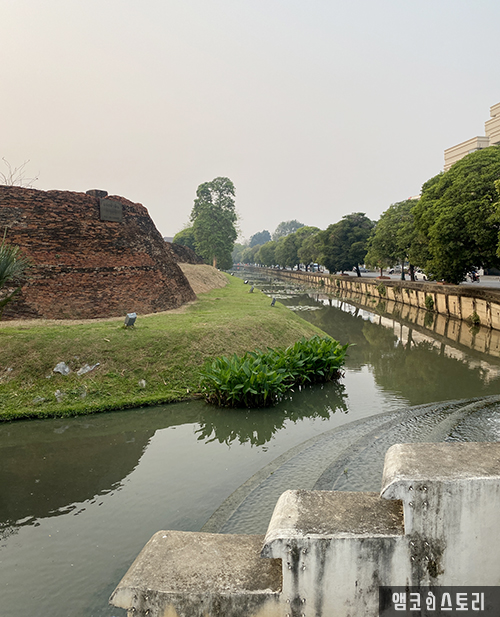 성벽은 거의 유실되어 있지만 코너 쪽이나 성문 부근은 잘 보존되어 있어 부분부분 관찰할 수 있었습니다. 주위를 둘러싼 연못을 따라 오래된 큰 나무들이 울창해서, 역사가 깊은 오래된 도시라는 걸 더 잘 느낄 수 있었습니다. 2월 기준으로, 아침 7시쯤 조깅을 하면 해가 뜨는 걸 보면서 달릴 수 있어 너무 멋졌습니다. 태국은 높은 건물이 없어서 해가 뜨는 걸 어디서든 잘 볼 수 있었고, 연못에 비추는 일출은 바다의 일출과 또 다른 아름다움이었습니다.
