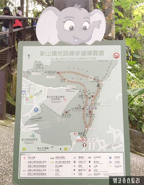 이곳은 많은 분들이 SNS를 통해 타이베이 시내 정경 및 야경을 소개하는 곳입니다. 정상까지 등산하는 데 걸리는 시간은 한 30분 정도로 그리 오래 걸리지 않습니다. 하지만, 시작부터 가파른 계단이 거의 정상까지 이어져 있어서 난이도는 꽤 높은 편이라 할 수 있겠네요. 산을 오르기 전 충분한 준비 운동 및 수분 섭취는 필수입니다.