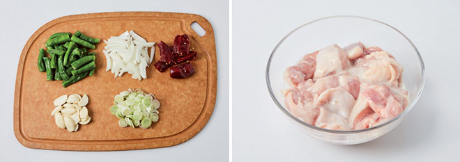 꽈리고추(2줌=100g), 양파(2개), 건고추(3개), 마늘(10쪽), 대파(1대), 닭다릿살(400g)