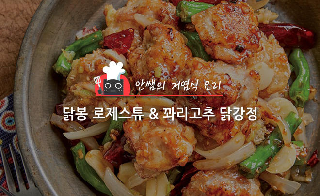 오늘 소개할 요리는 닭봉 로제스튜와 꽈리고추 닭강정입니다. 닭봉 로제스튜는 칼륨 함량이 높은 토마토와 감자로 나트륨 배출에 돕고, 양파를 이용하여 단맛을 내고 첨가당 사용을 줄였습니다. 꽈리고추 닭강정은 건고추, 마늘, 대파로 만든 기름의 은은한 향으로 자극적이지 않은 맛을 냈고, 양파를 이용하여 첨가당 사용을 줄였습니다.