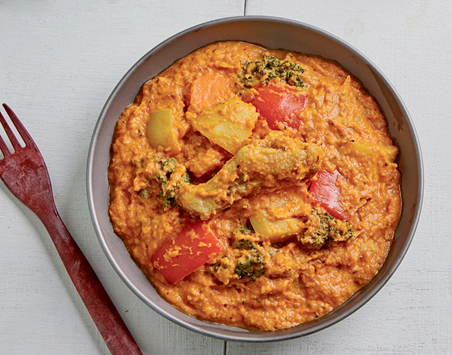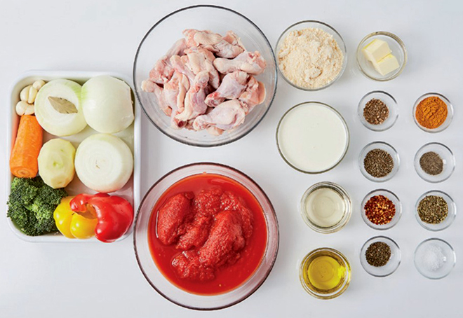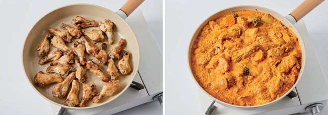 ⑥ 같은 팬에 손질한 채소를 넣어 볶다가 구운 닭봉, 토마토소스를 넣어 10분간 끓이고, 생크림과 파르메산 치즈가루를 넣어 자작해질 때까지 졸여 마무리한다.
