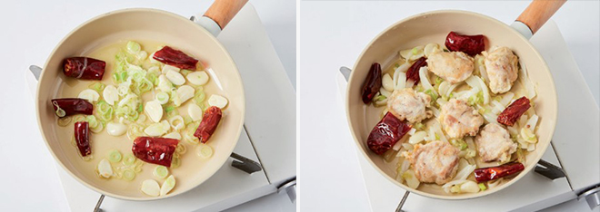 ③ 약한 불로 달군 팬에 식용유를 두른 뒤 손질한 건고추, 마늘, 대파를 넣고 볶아 기름을 낸다.