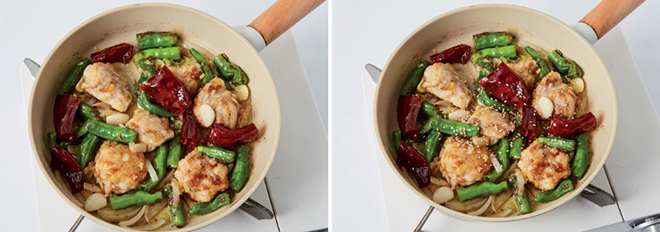 ⑤ 센 불에 올린 뒤 양념장을 넣어 재빠르게 볶고, 꽈리고추를 넣어 10초간 볶아 꺼낸다.