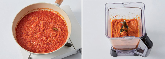 ④ 강황, 코리앤더가루, 커민, 레드크러쉬드 페퍼, 바질가루, 오레가노 가루를 넣어 섞고, 한 김 식힌 뒤 믹서에 곱게 갈아 토마토소스를 만든다.