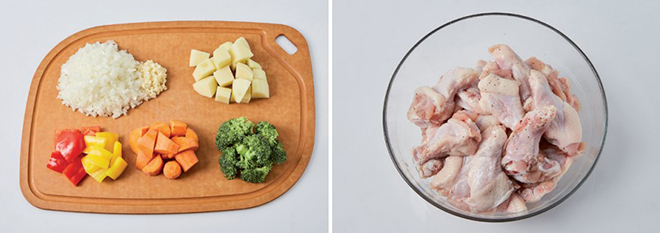 ① 양파와 마늘은 다지고, 감자, 파프리카, 당근은 한입 크기로 썰고, 브로콜리는 송이만 떼어낸다.