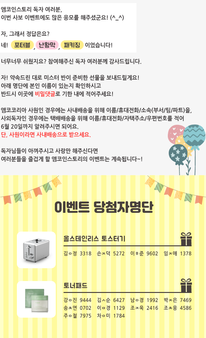 | 환경을 살리는 OX퀴즈 이벤트 결과 발표 _ 웹진 [앰코인스토리] (2) | 2023.06.26 |