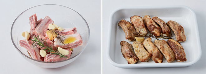 ③ 손질한 등갈비는 밑간한 뒤 마늘, 로즈메리와 함께 버무려 30분 정도 재운다.