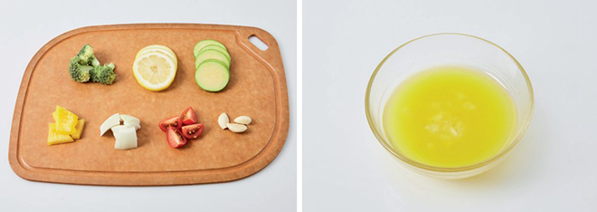 ① 브로콜리는 송이만 떼어내고, 애호박과 레몬은 4mm 두께로 둥글게 썰고, 양파와 노랑 파프리카는 한입 크기로 썰고, 방울토마토는 4등분하고, 마늘은 꼭지를 제거한다.