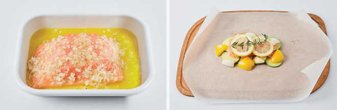 ④ 종이포일에 애호박, 연어, 레몬, 로즈메리 순으로 깔고, 손질한 채소를 올린다.
