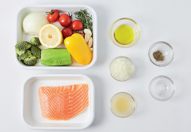 브로콜리(¼개), 애호박(½개), 레몬(½개), 양파(½개), 노랑 파프리카(¼개), 방울토마토(5개), 마늘(8쪽), 연어 필레(270g)