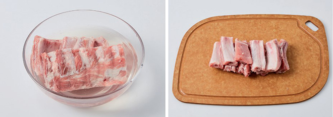 ① 등갈비는 찬물(5컵)에 담가 1시간 이상 핏물을 제거한다.