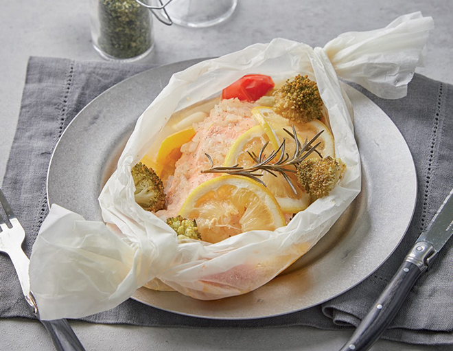 프랑스어로 사탕 포장 종이, 버터(기름)를 먹인 종이 등의 뜻을 지닌 ‘파피요트’는 유산지나 종이 호일 안에 고기와 채소 등을 싸서 익힌 먹는 요리를 말합니다. 생선이나 육류 요리의 빼놓을 수 없는 새콤한 소스로 자리 잡은 레몬은 히말라야가 원산지로 이탈리아, 스페인, 미국, 오스트레일리아 등에서 많이 재배되는데, 지중해 연안에서 생산되는 것이 가장 품질이 좋다고 합니다. 레몬은 껍질에서 레몬유를 짜서 음료나 향수 및 레모네이드의 원료로 사용하고, 과즙은 음료, 식초, 화장품의 원료나 과자의 향료로도 사용합니다. 비타민C와 구연산이 풍부하기 때문에 레몬은 신맛이 강하고 감기 예방에 도움을 준다고 합니다.