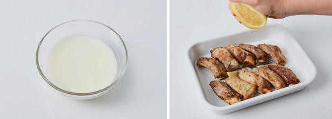 ⑥ 그릇에 등갈비구이를 담은 뒤 레몬을 짜 즙을 뿌리고, 디핑 소스를 곁들여 마무리한다.