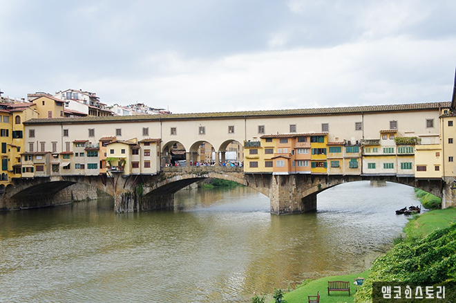 미술관 관람을 바치고 베키오 다리로 간다. 피렌체의 아르노(Arno)강에 있는 다리 중에 가장 오래된 것으로 14세기 때부터 다리 위에 상점들이 생겼다고 하는데, 다리 위에 상점이 있는 것이 특이하다.