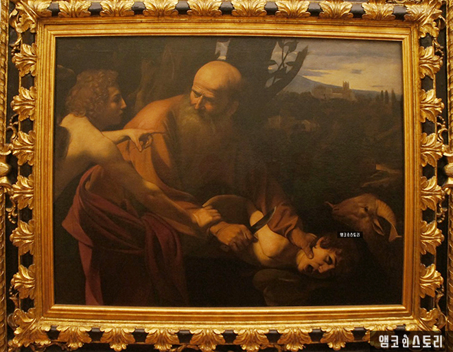 카라바조의 또 다른 작품인 <이삭의 희생>이다. 창세기 22장에 나오는 이야기를 묘사한 작품인데, 하나님이 아브라함을 실험하기 위해 100살이 되어 얻은 귀한 외아들을 제물로 바치라는 명령을 내린다. 아브라함은 명령을 받들기 위해 아들 이삭의 목을 베어 제물로 바치려 하는 순간, 천사를 보내 아브라함을 말리는 장면을 묘사한 작품이다. 이삭의 겁에 질린 눈이 관람객을 향해 살려달라고 애원하는 듯 보인다.