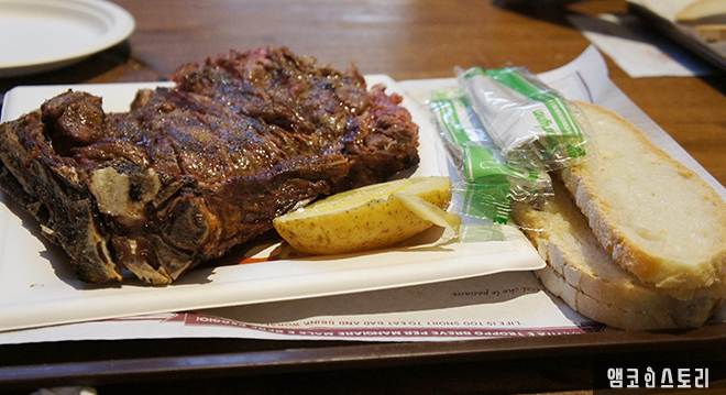호텔 직원이 추천해준 티본스테이크 집을 찾았다. 스테이크를 주문하니 손님이 보는 앞에서 자른 후 확인까지 시켜준다.