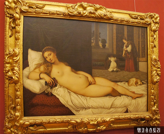 아래 작품은 티치아노의 대표작 <우르비노의 비너스>다. 역사상 가장 눈 여겨 볼 만한 누드 작품이라고도 하는데, 그림 속의 여인은 신화에 나오는 비너스가 아니라 베네치아 귀족 여인을 그린 것으로, 몸치장을 받으려고 기다리는 모습을 그린 것이라고 한다.
