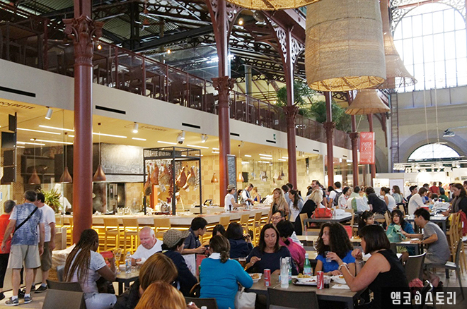 여러 음식점들이 빙 둘러 있고, 가운데 테이블에서 자유롭게 먹을 수 있게 되어있는 구조다.