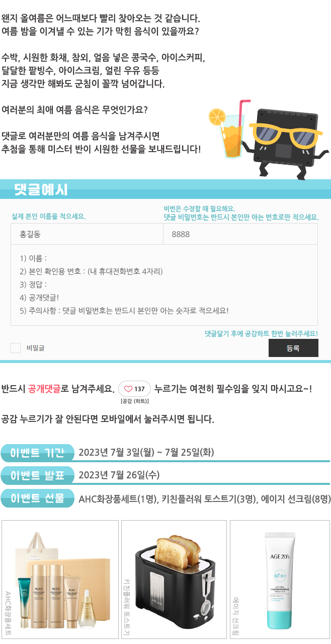 | 나만의 여름 음식! 이벤트 결과 발표 _웹진 [앰코인스토리] (3) | 2023.07.26 |